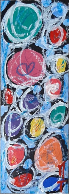 Peinture acrylique, crayons, 2 couches de vernis, signature à l'avant et au dos.