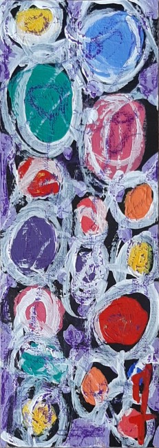 Peinture acrylique, crayons, 2 couches de vernis, signature à l'avant et au dos.
