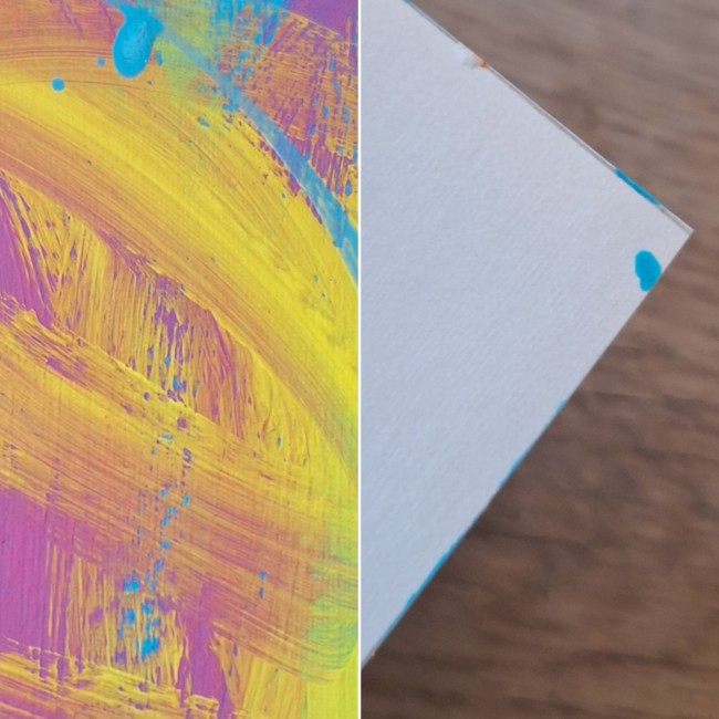 La peinture n'est pas lisse car il y a un peu de texture. Les couleurs peuvent varier d'un écran à un autre. L'oeuvre étant l'originale et faite à la main, il y a quelques tâches au dos de la feuille.