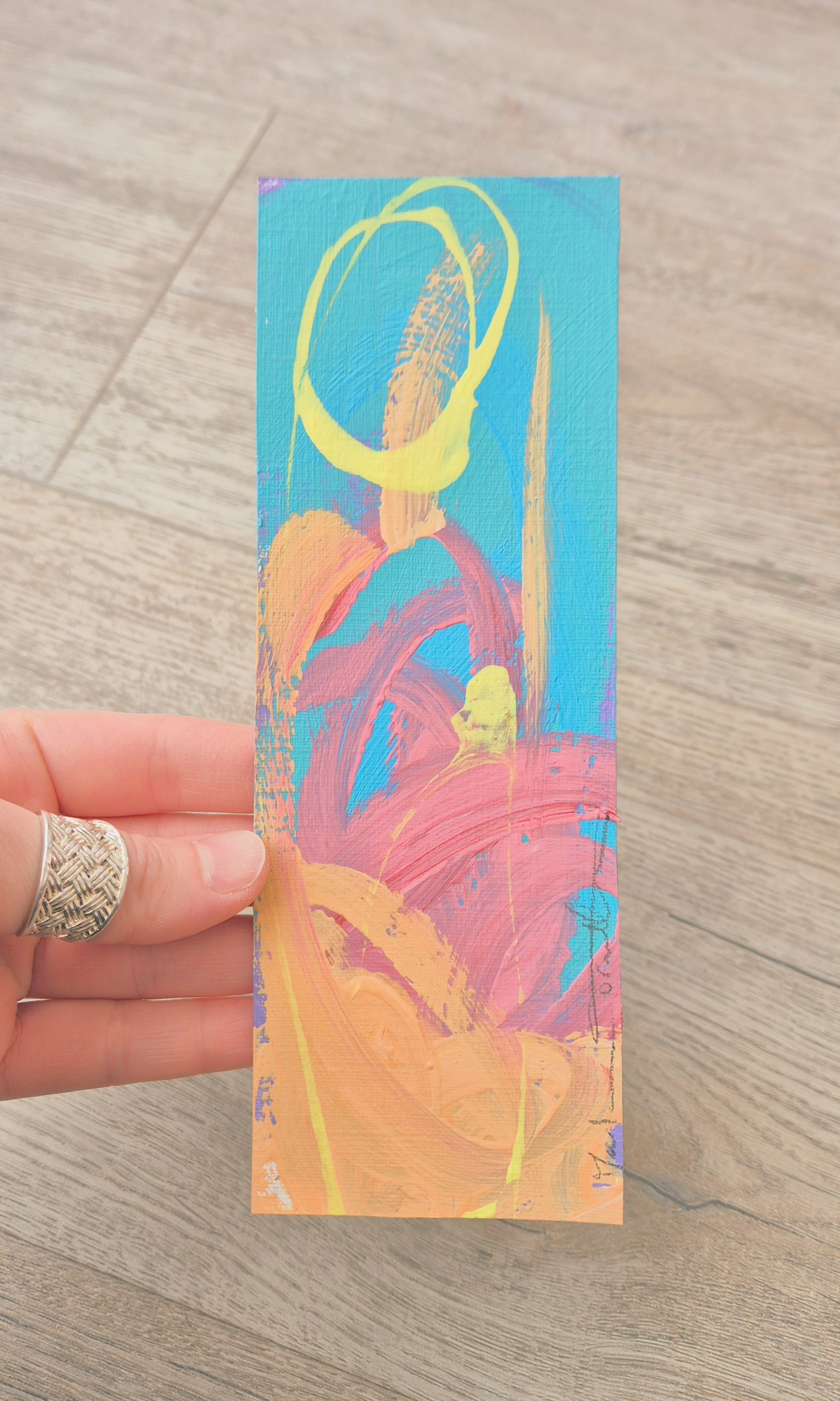 Peinture sur feuille, mini-oeuvre de 20x7 cm, utilisée comme marque-page, oeuvre unique et originale.